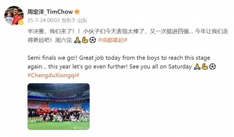 周定洋在社交媒体上更新了球队赛后与球迷的大合影,并写道:“半决赛,我们来了!!小伙伴们今天表现太棒了,又一次齐心协力……” 今年让我们走得更远吧!周六见 👋💪⚽️